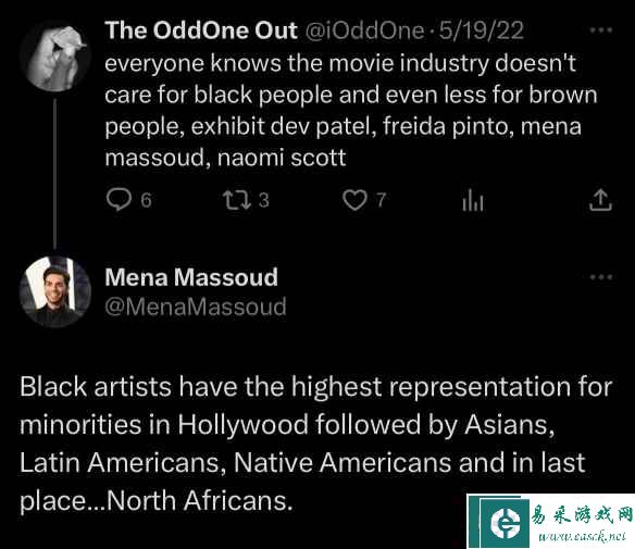 随后,他在2022年的一则推文也被网友扒出疑歧视黑人,当时他点评一则关于电影行业根本就不关心黑人,更别说棕种人的推文,梅纳称:“黑人是好莱坞少数族裔代表性最高的群体,其次是亚裔、拉美人、印第安人,最后才是北非人。”