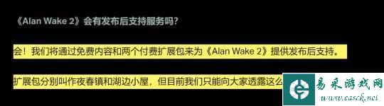 玩家在打通《心灵杀手2》后可以继续享受其故事,因为Remedy确认他们会在游戏发售后继续提供新内容,这包括两个付费DLC以及免费内容。 Remedy娱乐在《心灵杀手2》官网QA问答页面上确认“将通过免费内容和两个付费扩展包来为《心灵杀手2》提供发布后支持。扩展包分别叫作夜春镇和湖边小屋。”
