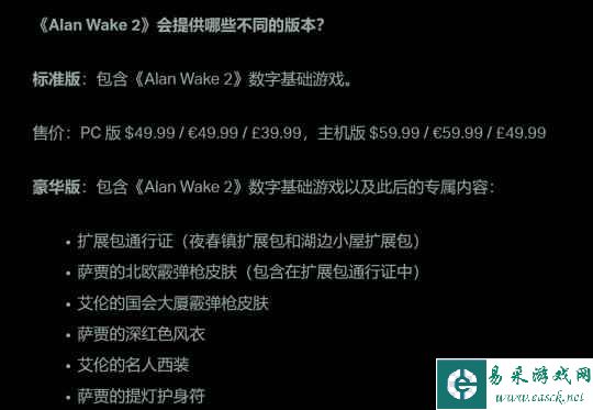 《Alan Wake 2》的发行日期是什么时候? 《Alan Wake 2》将于 2023 年 10 月17 日全球发行。 《Alan Wake 2》将在哪些平台上推出? 《Alan Wake 2》将通过 Epic Games Store 推出 PC 版,PlayStation 5 和 Xbox Series X|S 版也会同步发行。 《Alan Wake 2》讲述的是什么故事? 萨贾·安德森是一位因擅长破解疑难案件而著称的 FBI 分析大师。她来到辉落镇是为了调查一系列的仪式谋杀案。而随着安德森发现一个恐怖故事的书页,书中的恐怖故事开始化为现实时,整个案件由此陷入了一场噩梦之中…… 艾伦·韦克,一位迷失的作家,被困于我们世界之外一个噩梦般的监狱之中,他书写了一个黑暗的故事来塑造现实,妄图从绝望中逃离。尽管一直被一个永不餍足的恐怖之物追捕,韦克仍然挣扎着保持理智,尽全力在自己的游戏中击败那个恶魔。 安德森和韦克,两位各自踏上绝望旅程的主角。两段以二人完全无从理解的方式联系在一起的独立现实。回声化作了反射,而反射又能触及彼此。 两人被困于一个恐怖故事之中,只能扮演着受害者和怪物的角色,到底他们能否突围而出,成为理想中的英雄呢? 需要玩原版《Alan Wake》才能完全理解《Alan Wake 2》吗? 《Alan Wake 2》虽是续作,但同时也构成独立的游戏体验。新手玩家无需了解前作就能享受这场惊心动魄的旅程。 而对于老粉丝来说,里面则有大量的因果和联系等待着你们去发现。 需要玩《Control》或《Control》的 AWE(异世界事件)扩展包才能更好地理解《Alan Wake 2》吗? 不需要。 不过对于喜爱钻研《Alan Wake》宇宙的粉丝来说,绝对推荐这么做,玩家可自行选择。 《Alan Wake 2》为什么只有纯数字版? 关于这一点,原因有很多。首先,很多玩家已经转向了纯数字版。大家可以购买不含光驱的 Sony PlayStation 5,而且 Microsoft 的 Xbox Series S 也是纯数字版主机。发行纯数字版现代游戏的情况已经司空见惯了。 其次,不发行光盘有助于将游戏价格控制为 $59.99 / |