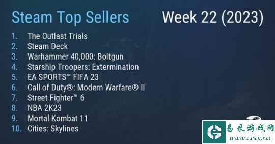 以下为 2023 年 5 月 23 日至 5 月 30 日 Steam 销量排名前十: 1.《逃生:试炼》 2. Steam Deck 3.《战锤40K:爆矢枪》 4.《星河战队:灭绝》 5.《FIFA 23》 6.《使命召唤19:现代战争2》 7.《街头霸王6》 8.《NBA 2K23》 9.《真人快打11》 10.《城市:天际线》