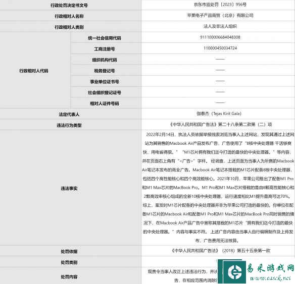 因此,案发时M1芯片配备的中央处理器并非苹果公司打造的最快的。依据《中华人民共和国广告法》的相关规定,北京市东城区市场监督管理局作出相应的行政处罚。