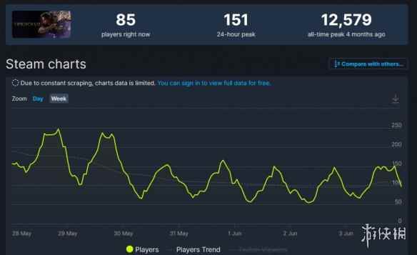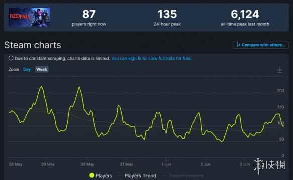 4.《红霞岛》Steam在线人数不及《魔咒之地》 据SteamDB显示,作为2023年最让人失望的两款游戏,Arkane的《红霞岛》Steam24小时内的同时在线人数已不及SE的《魔咒之地》。