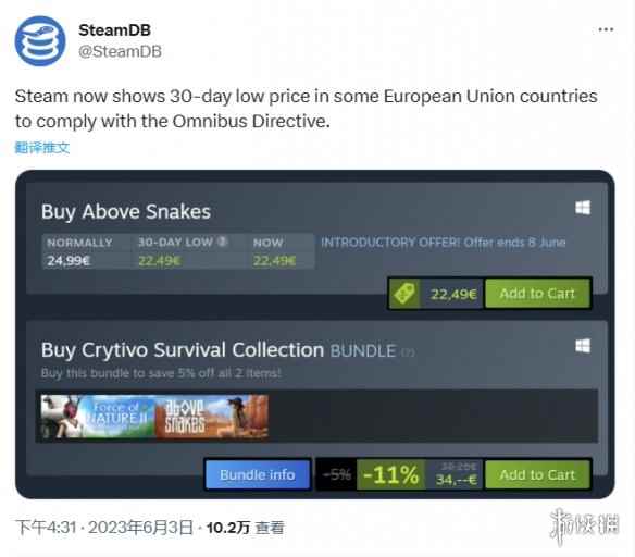 6.欧盟一些地区Steam页面游戏价格将更透明 SteamDB称由于欧盟地区的立法,将迫使游戏发行商在游戏价格方面更加透明,一些欧盟地区的Steam页面将必须显示30天内的游戏的最低售价,以及当前和折扣价标签,以让买家在使用 Steam 购买游戏时做出更明智的决定。
