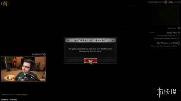 《暗黑破坏神4》发售日后人气火热,海外直播平台Twitch上的顶流主播Shroud也开始了在硬核难度下游玩的挑战,但由于《暗黑破坏神4》的服务器太烂,他的满级角色因为服务器延迟问题被卡死然后掉线,硬核难度下角色死亡只能重头开始,他的所有努力全部白费了。网友分享了直播片段,纪录下了这一惨痛画面。 【网】海外顶流主播Shroud《暗黑4》硬核难度满级角色因掉线死亡 从视频中可以看到,Shroud在刷怪过程中突然异常卡顿,所有的怪都卡住不动,然后一瞬间他的角色就死了,随后客户端发送了一条消息显示:“网络断开 ,游戏连接已丢失,您的客户端已与服务器断开连接”。