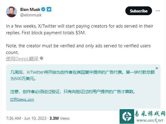 今天,推特老板埃隆・马斯克表示,推特将在几周后开始向认证的内容创作者支付在其推文评论中投放广告产生的收益,第一批支付总额约为500万美元。马斯克在推特上说:“注意,创作者必须是认证的,而且只有对认证用户投放的广告才算数。”