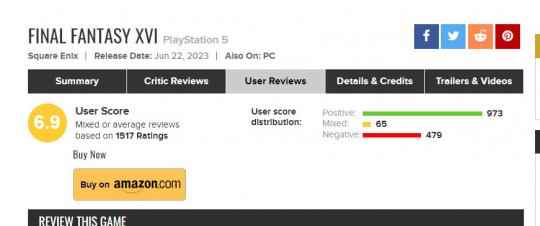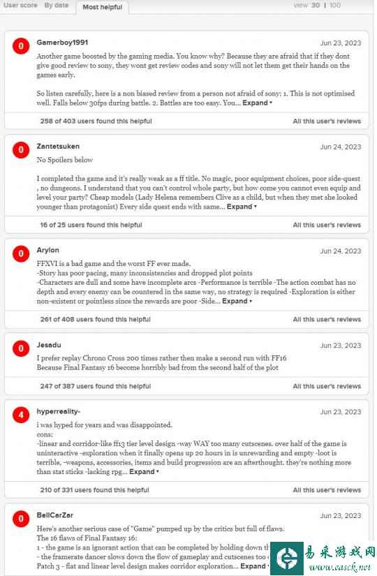之所以称是恶意,原因在于有国外玩家发现一些打0分的用户的规律:凡是索尼或索尼限时独占的游戏,就给0分,凡是Xbox的游戏就给满分。比如下图中的这两位,给了《红霞岛》10分满分,给了《最终幻想16》和《地平线:西之绝境》0分。 平台粉丝之间的对抗火药味十足。如此下去,今年9月发售的《星空》和10月的《漫威蜘蛛侠2》都不可避免地遇到差评轰炸。 所以目前来看,《最终幻想16》在MTC上的玩家评分显然不能担任参考。《最终幻想16》MTC媒体评分88分,作为一个比较受期待的3A大作,这个评分只能说能接受,虽然很遗憾没有拿下MTC的“必玩(must play)”标签。 有玩家指出《最终幻想16》自然不可能是0分,甚至不可能低于5分,他的个人评分为7.5-8分之间。因为这款游戏还存在一些问题,比如支线任务不行,缺少大量RPG元素(因为太注重于动作),有一些节奏问题和性能问题。