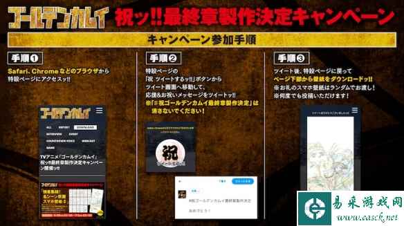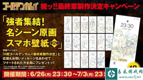 从4月开始播出的TV动画《黄金神威》第四季在26日播出了最终话,之后官方便公布“最终章制作决定”的信息。为了纪念此次决定,官方将随机抽选用户赠送壁纸,具体活动详情请前往官方推查看。