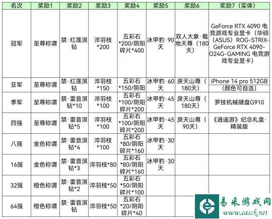 近日大荒可谓是热闹非凡,大家翘首以盼的问鼎天下·3V3标准号全国赛将于7月5日更新后正式开启!少侠们准备好迎战了吗? 令人惊喜的是,《天下3》不仅为本次竞赛准备了常规的奖励,而且加入了军饷瓜分机制、全民竞猜机制,还对四强队伍的奖励进行了“重量级”加码!GeForce RTX 4090 电竞游戏专业显卡、iPhone 14 pro、罗技机械键盘G910、《逍遥游》纪念礼盒·精装版等实体好礼的重磅加码势必会让战事更加激烈! 事不宜迟,下面一起来看看这次赛事的相关资讯吧! 赛程及赛事规则 本次问鼎天下赛事分为积分赛和淘汰赛,积分赛在7月5日-7月23日的每周五六日20-24时开放,7月24日凌晨1点积分赛正式结束,7月24日12:00公布64强名单。随后,淘汰赛将在7月29日下午开启,从64支队伍中决出四强。7月30日进行半决赛、季军赛和决赛。 积分赛期间,只要战队在线人数大于等于3,且至少有3人不同门派,战队内任一成员就可以在积分赛匹配期间进行战队报名。战队将拥有2000分的初始积分,战队积分达到2500分之前,负场不扣分。每一场胜负的加减分有所不同,具体与本队、敌方战队的积分有关。 竞技狂欢,瓜分千万军饷~ 淘汰赛终极好礼 问鼎天下赛事中,能走到淘汰赛的少侠,绝对是百里挑一的高手,而能从高手如云的队伍中脱颖而出的冠军,更是个中翘楚。 因此,本次赛事,《天下3》不仅为冠军队伍准备了常规的道具奖励,如至尊称谓、红钻、淬羽枝、珍贵坐骑,还为他们准备了每人一个的GeForce RTX 4090 电竞游戏专业显卡! 亚军、季军、四强队伍的奖励同样得到了加码,而且是战队成员人手一份哟~亚军队伍成员可获得iPhone14 pro(512GB);季军队伍成员均可获赠罗技机械键盘G910;四强队伍的少侠将获得《逍遥游》纪念礼盒·精装版!