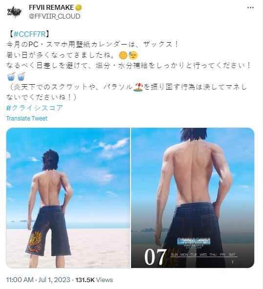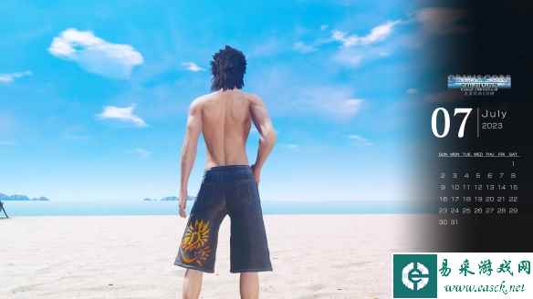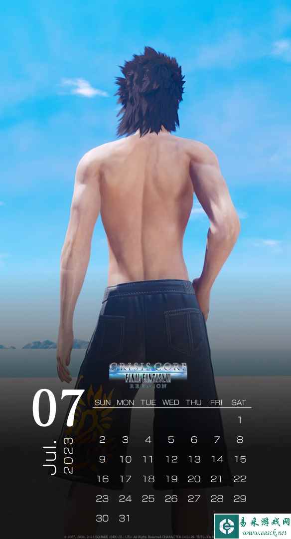 《最终幻想7:核心危机 重聚》官方发布了7月夏季的日历壁纸,壁纸看上去十分的“清凉”。 “这个月的个人电脑和智能手机壁纸日历是扎克斯!越来越热了。 请尽量不要在阳光下暴晒,并注意保持水分,用盐和水补充水分!(请千万不要模仿在烈日下蹲着或挥舞阳伞的行为!)”