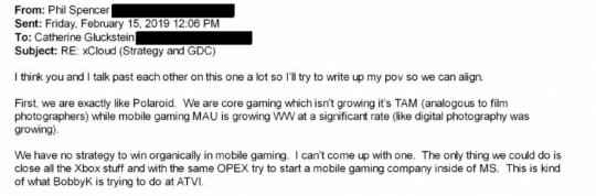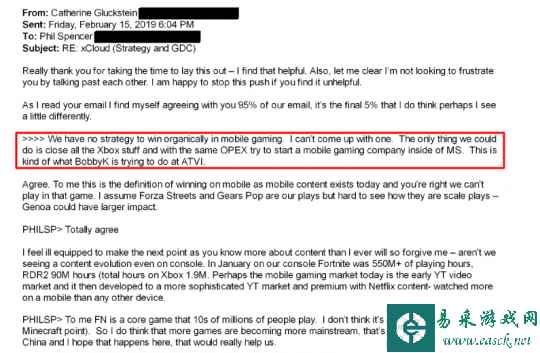 在一封写于2019年的电子邮件中(该邮件是给Xbox总裁Catherine Gluckstein),斯宾塞写道:“我们没有一个能够让我们在移动游戏领域有机取得胜利的战略,我想不出来。唯一能做的就是关闭与Xbox有关的一切,并以相同的运营成本在微软内部尝试创建一家移动游戏公司。这正是Bobby Kotick正试图在动视暴雪实施的策略。”
