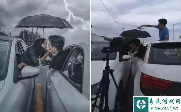 雨中的错车浪漫拥吻照看起来很高级,但实际上,雨是用矿泉水浇灌的,闪电则是后期合成的