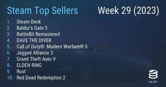 Steam最新一周销量榜出炉(2023年7月11日-2023年7月18日),Steam Deck再次登顶,达成三连冠,《博德之门3》受直播“人熊”事件的推动一跃来到了第二名,另外,那个游戏5再次回到榜单,位于第七名。 TOP 10榜单: 1.?Steam Deck 2.?《博德之门3》 3.?《BattleBit Remastered》 4.?《潜水员戴夫》 5.?《使命召唤:现代战争2》 6.?《铁血联盟3》 7.?《GTA5》 8.?《艾尔登法环》 9.?《腐蚀》 10.?《荒野大镖客2》