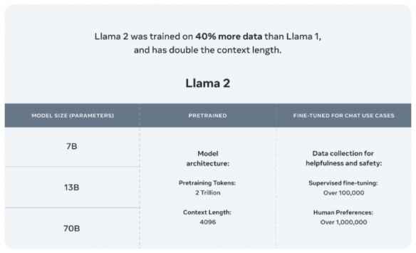 与2月发布的Llama 1相比,训练所用的token翻了一倍至2万亿,同时对于使用大模型最重要的上下文长度限制,Llama 2也翻了一倍。Llama 2包含了70亿、130亿和700亿参数的模型。