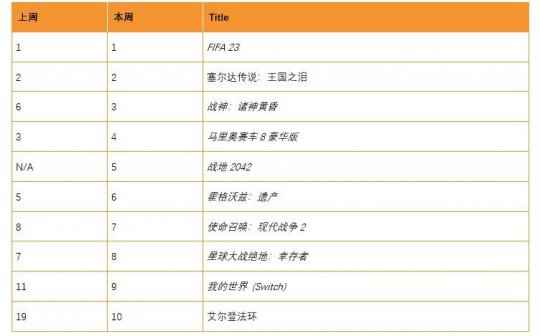 Gfk 本周英国实体零售排行榜现已出炉,EA Sports 的《FIFA 23》再次位居榜首,销量增长了 6%。 《塞尔达传说:王国之泪》仍位居第二。DICE 的《战地2042》,重新进入排行榜,排名第五。