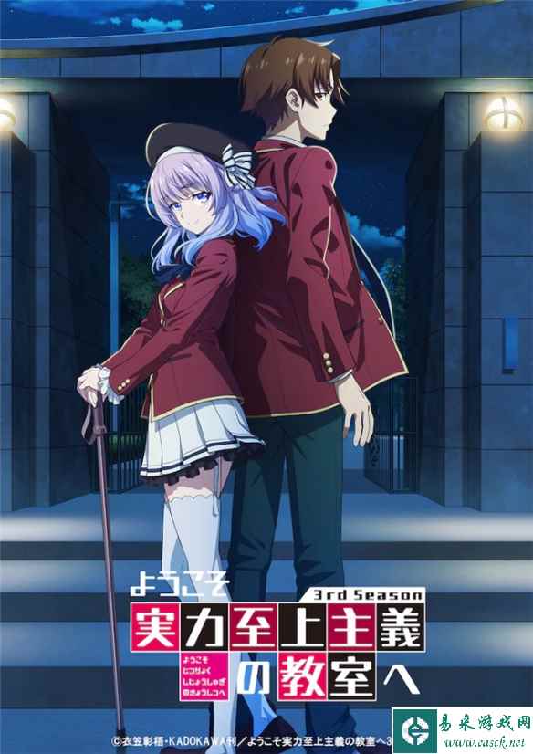 《欢迎来到实力至上主义教室》第三季将于2024年1月开播,在这次公布的主视觉图中,我们可以看到绫小路清隆和坂柳有栖背对而立的身影。