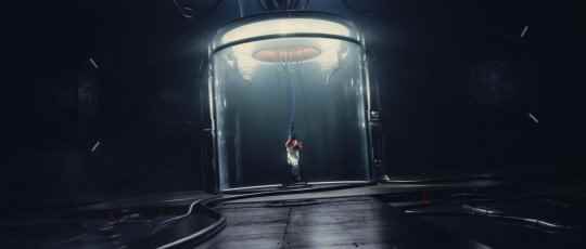 镜头由远及近,一切又有点不太一样。这位人类“母亲”,怀抱的竟是一个难以名状的“怪物”。而“怪物”则被容纳在科技打造的仪器中,伴随着童谣音律的上扬,容器红灯闪烁,畸变体破壳而出,犹如打开了潘多拉的魔盒,预示着灾厄在即。