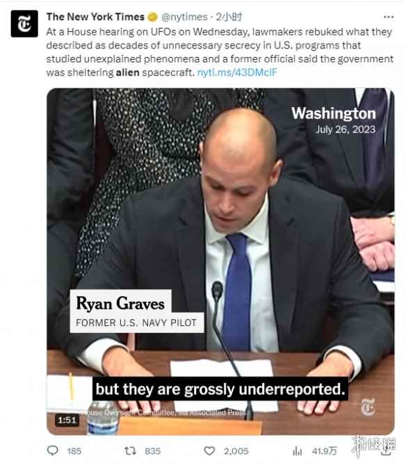 根据报道,UFO举报人在美国听证会上表示,美国从坠毁的飞船中救出了非人类生物飞行员,目前相关消息已经登上了推特全球趋势。 美国众议院一个小组今天将就UFO问题举行国会听证会,前美国空军情报官员大卫·格鲁什确认美国政府自1930年代以来就已经了解到与UFO相关的“非人类”情报,美国从坠毁的飞船中回收了非人类生物飞行员遗骸。 美国退役海军指挥官大卫·弗拉沃尔表示,他在2004年亲眼目睹了那一幕:“我们面对的技术远远优于我们拥有的任何技术。” |