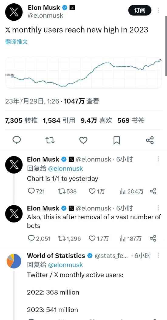 该图片并无横坐标,马斯克在评论区补充道该图片是“1/1 to yesterday”,且数据是删除了大量僵尸号的“脱水数据”。 World of Statistics机构还分享了 2022 年的推特月活用户数据,表示去年月活数量为3.68 亿。 当下正值推特改名X,公司进行组织变革,希望提高近日下滑的广告收入;这也是自月初扎克伯格发布推特竞品Threads来,马斯克这边给出的最有力的回应。 今年5月,马斯克任命NBC环球前广告主管Linda Yaccarino为X的首席执行官,表明广告销售是重中之重,尽管该平台正在努力增加订阅收入。 马斯克本月早些时候表示,由于广告收入下降近50%,加上沉重的债务负担,X的现金流为负,但他没有提供细节。