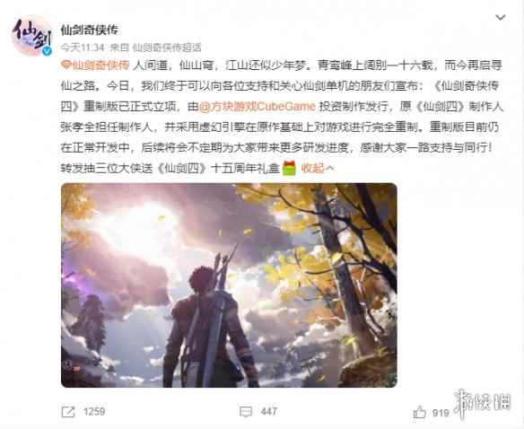 官博原文:人间道,仙山穹,江山还似少年梦。青鸾峰上阔别一十六载,而今再启寻仙之路。今日,我们终于可以向各位支持和关心仙剑单机的朋友们宣布:《仙剑奇侠传四》重制版已正式立项,由@方块游戏CubeGame 投资制作发行,原《仙剑四》制作人张孝全担任制作人,并采用虚幻引擎在原作基础上对游戏进行完全重制。重制版目前仍在正常开发中,后续将会不定期为大家带来更多研发进度,感谢大家一路支持与同行!