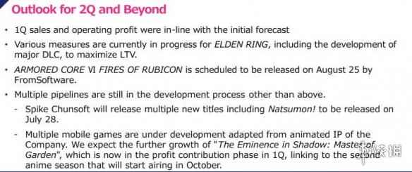 不过遗憾的是,角川的财报中并没有提及“黄金树之影”DLC何时发售,在上一季度的报告中,有信息暗示DLC可能不会在2024年4月之前发售。