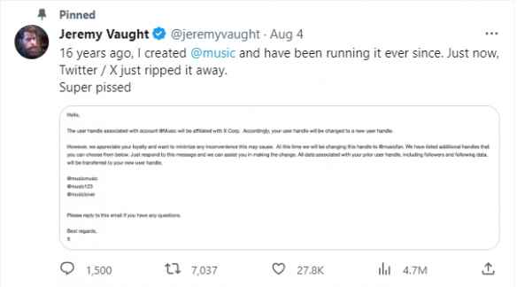 早些时候,推特在更名X后,在没有实质补偿的前提下,强制占用了一名用户的账号“@X”。现在,推特再次动手,“强抢”了另一名用户经营16年的账号:@music。