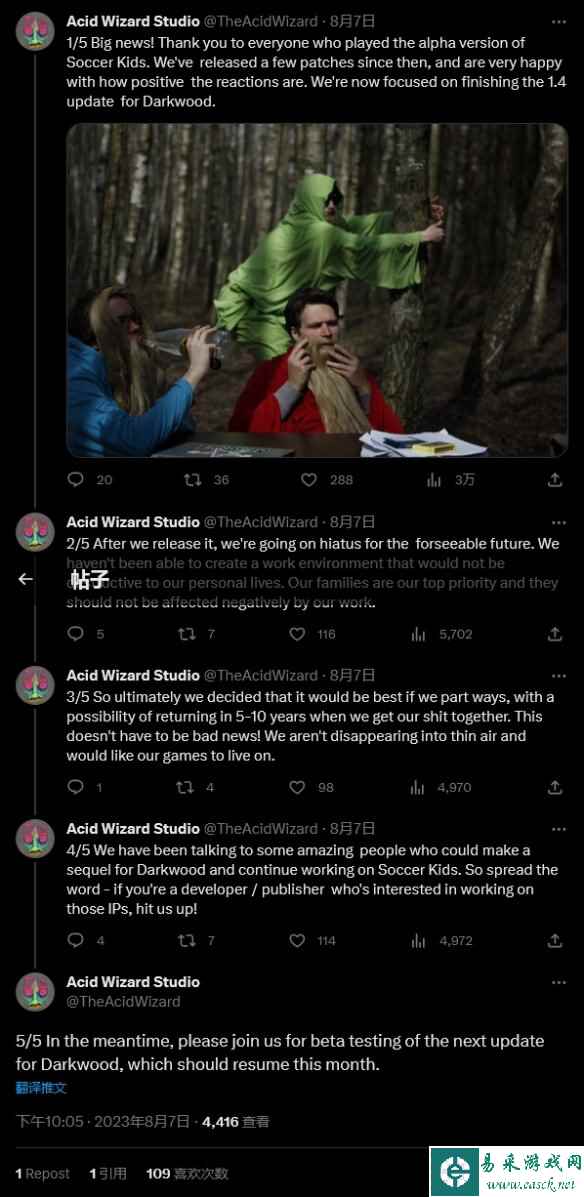 Acid Wizard 此前曾在 2018 年《阴暗森林》发布后停业了 1 年时间,这款游戏花了 5 年时间开发,当时工作室表示开发已经从“精神上和身体上”耗尽了他们的精力。 |