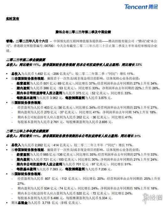 腾讯第二季业绩:总收入2992亿元 游戏部分收入强劲