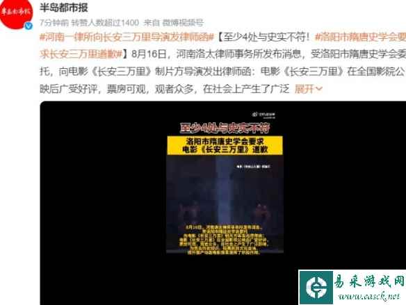8月16日,河南洛太律师事务所发布消息,受洛阳市隋唐史学会委托,向电影《长安三万里》制片方导演发出律师函。