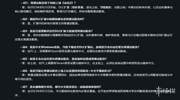 普通话配音所覆盖的DLC有暗影要塞、凌光之刻、邪姬魅影和光陨之秋。不仅如此,实时赛季和核心游戏模式如:熔炉竞技场、智谋与打击模式也将得到完整的普通话配音支持。 在PC平台上,玩家只需将Steam语言设置为简体中文,就能体验到普通话的配音。同时这一更新也解决了探索过程中配音混杂的问题。