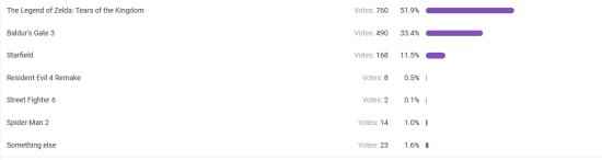 根据投票结果显示,前三款游戏《塞尔达传说:王国之泪》、《博德之门3》和《星空》的得票率加起来超过了95%,其中,《塞尔达传说:王国之泪》以51.9%的高票率位居第一。
