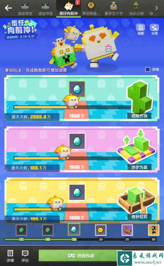 如此萌趣的蛋仔皮肤如何获得呢?8月18日~8月31日,玩家参与联动玩法,通关后即可获得通关次数,每天最多可累计10次通关次数。当全服某一赛道累计次数达一定值时,参与过此赛道的玩家都可以获得对应奖励。个人的通关次数达到一定值时,也可以领取对应奖励。玩法丰富,奖励多多,快叫上小伙伴一起完成任务,把苦力怕蛋仔领回家吧!
