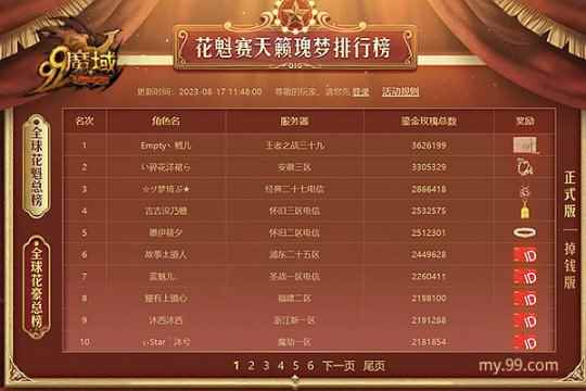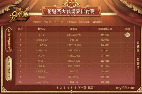 而随着《魔域》花魁赛榜单战况的愈演愈烈,众多女神玩家也纷纷上演八仙过海各显其能,在《魔域》达人秀中使出十八般武艺。正式服全球花魁总榜冲榜前三名的有擅长游戏绘画,喜欢光效外套的才女Empty丶鳕儿,也有擅长游戏视频制作,堪比游戏体验官的可爱萌妹い碎花洋裙ら,更有攻略达人☆ヅ梦琦ぷ★这样的大神玩家,可以说是不遗余力的花式拉票,只为摘得全球花魁的桂冠!正式服全球花豪总榜的争夺同样激烈,泊、梦、心凉城惜暖玉方、女少湖洋乐*三人齐头并进,为博花魁一笑也为争夺花豪总冠,豪掷万千玺金玫瑰!