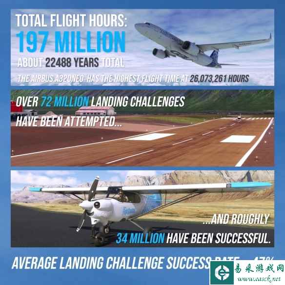 《微软飞行模拟》游戏于2020年8月18日发行,游戏开发商Asobo Studio今天发布系列推文,晒出了游戏的相关数据,一起来看看吧! Cessna 152是游戏中最受欢迎的飞机,已累计飞行85972254次,其次是空中客车A320NEO和波音F / A-18超级大黄蜂。 过去3年时间里,游戏中玩家累计飞行超过440亿英里,飞行次数超过7.11亿次。 洛杉矶国际机场是游戏中最受欢迎的机场,其次是纽约市的约翰肯尼迪国际机场和伦敦希思罗机场。 《微软模拟飞行》是由Asobo工作室开发并由Xbox游戏工作室发布的业余飞行模拟器游戏,为《微软模拟飞行系列》的正统续作,距2006年发行的上一部《微软模拟飞行 X》已经14年。 |