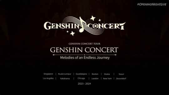 ·《原神》凭借精彩的游戏设计与可爱的人物设定等,在海外多个国家都深受欢迎,《原神音乐会Melodies of an Endless Journey》将带给世界各国游戏粉丝精彩的视听盛宴,敬请期待。