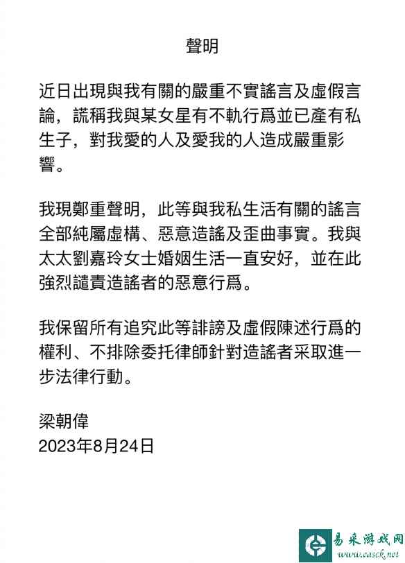 梁朝伟今天(8月24日)发文否认私生子传闻,并表示与太太刘嘉玲女士婚姻生活一直安好必要时会采取法律行动。