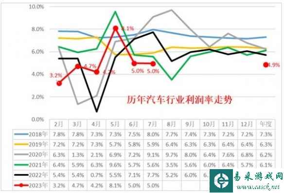 根据崔东树给出的数据,在2023年的前七个月里,中国汽车行业的总收入为53148亿元,同比增长了12%;成本为46378亿元,同比增长12%;利润2583亿元,同比增长1%; 汽车行业利润率为4.9%,相对于整个工业企业利润率5.4%的平均水平,汽车行业的利润率仍然是比较偏低的。而在2023年7月,中国汽车行业生产8217亿元,同比增长5%;成本为7149亿元,同比增长5%;利润407亿元,同比下降了30%;汽车行业利润率为5.0%左右。