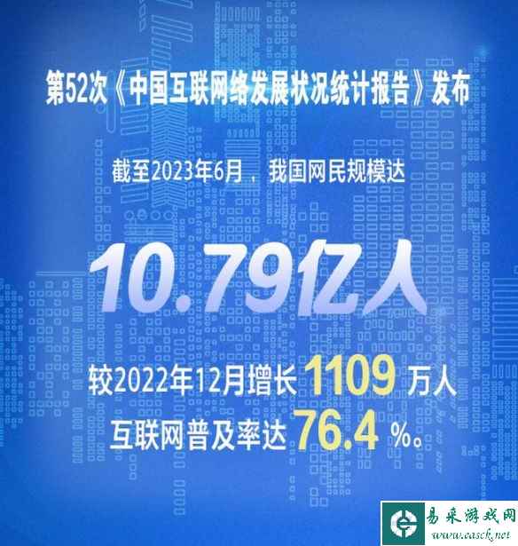 据央视新闻报道,中国互联网络信息中心今天发布第52次《中国互联网络发展状况统计报告》。《报告》显示,截至2023年6月,我国网民规模达10.79亿人,较2022年12月增长1109万人,互联网普及率达76.4%。