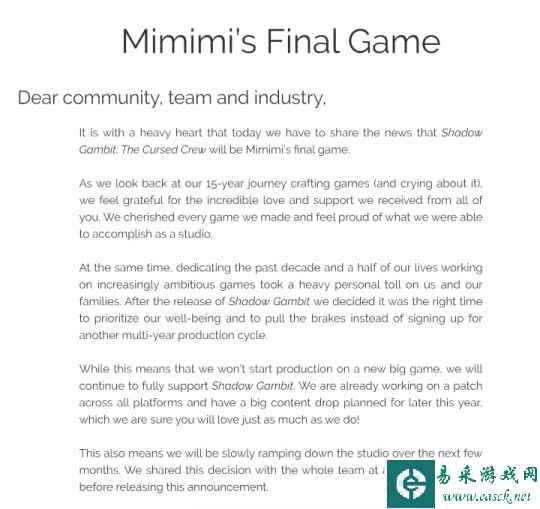 可就是这样一个有着老资历,也曾辉煌过的游戏工作室,在今年推出新作《影子诡局:被诅咒的海盗》后却解散了。与游戏本身无关,Mimimi Games在对外做出的回应中表示: “未来的制作成本增长速度超过了游戏类型潜在收入的增长速度。不断增加的财务压力和风险水平使工作室难以为继。为了工作室成员的福祉考量,最终决定关闭工作室。”