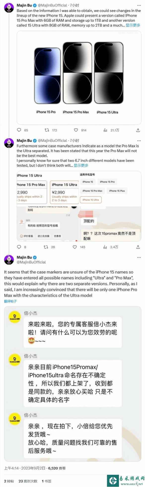 他表示:“根据我掌握的最新消息,苹果会调整iPhone 15系列的阵容。苹果会推出iPhone 15 Pro Max机型,但配备6GB内存,最高存储为1TB。苹果在此基础上会再推出iPhone 15 Ultra,配备8GB内存,最高存储为2TB,此外会配有更好的相机功能,售价也会上涨100美元。” 他还在推文中分享了部分保护套厂商的截图用于佐证,并表示今年会有5款机型,Pro Max版并非顶配。