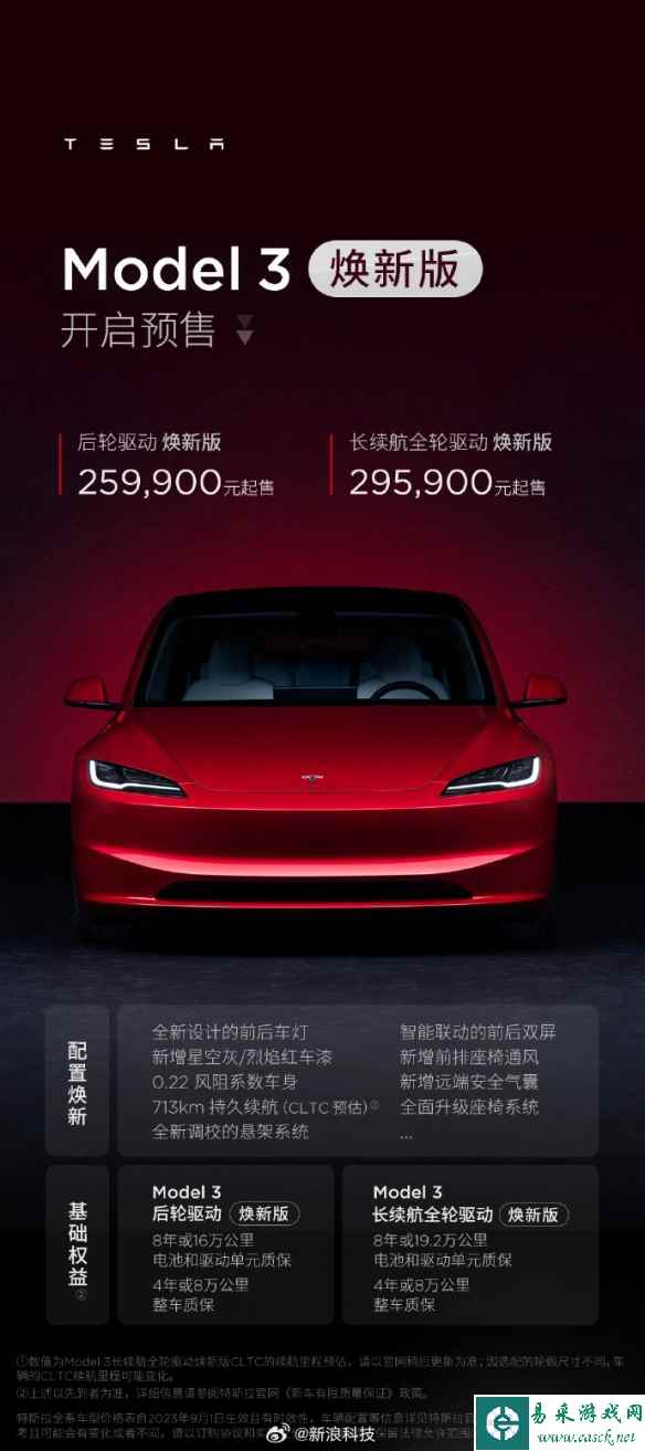 特斯拉Model 3新车型今天(9月1日)正式上线,新车型定名:Model 3焕新版,售价25.99 万元(后轮驱动),Model 3长续航焕新版:29.59 万元(双电机全轮驱动)。