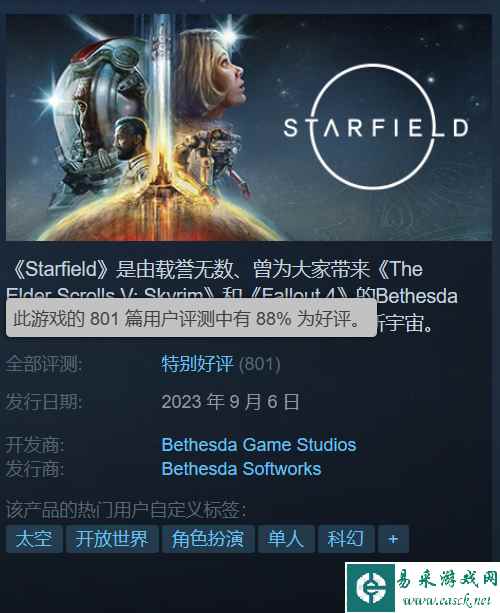 备受期待的B社科幻巨作《星空》现已正式发售,Steam评论区也已解禁,截止至本稿发出时《星空》在Steam上的评价为 特别好评 ,共有801个评论,好评率为88%,《星空》在Steam上的开局似乎还不错。