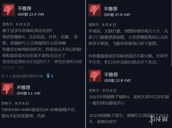 也有很多玩家直言B社开发数年之久的《星空》不能让人满意,让人期待落空,不像是一款2023的游戏,他们指出游戏存在太多缺点,例如:优化差、黑屏加载太多、AI太傻、枪械手感差劲、剧情演出烂 等,不推荐入手。