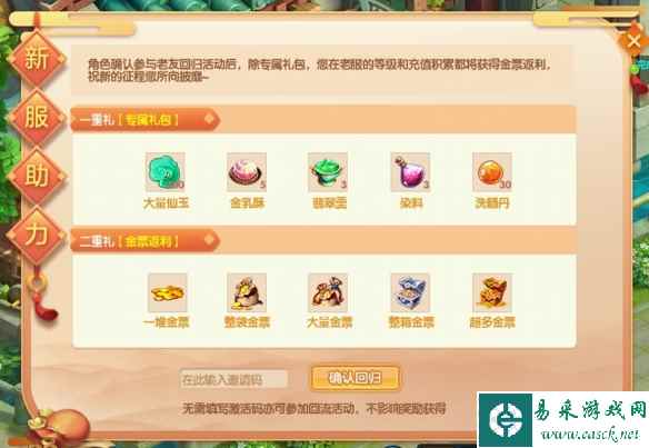 活动时间:2023年9月6日-10月6日 活动内容 任意玩家可创建队伍成为队长,最多邀请2位好友参与组队活动,邀请的好友需要在页面绑定游戏区服和游戏ID,绑定后即视为组队成功。 队伍满2或3人皆可领取礼包;队伍满员后,队长还能获得额外的专属礼包。每人仅可参与1次组队(不论作为队员还是队长)。 活动规则 本次活动奖励均发放到此绑定的角色里,帐号一经绑定后不可修改,请仔细确认后再绑定帐号角色。 活动最终解释权归游戏官方所有。 回归老服,重温快乐 活动时间:2023年09月08日12点-2023年09月14日24点 活动内容 相关NPC 洛阳(221,133)“老友接待使”。召回好友获得老友积分,好友回归后,每天活跃度达到100或充值都可为自己增加老友积分,积分物品用来抽取奖励!珍稀灵兽任选包、精灵之魂任选包、星图碎片任选包等超多丰厚大奖等你来拿! 活动规则 符合老友账号条件即可参与:必须是在2023年09月01日-2023年09月08日7点之间一直未登陆的账号,账号下任意一个角色都可以进行回归验证。