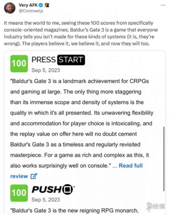 Michael Douse说到:“能看到来自专门面向主机的杂志打100分,对我来说意义重大。《博德之门3》是一款所有业内人士都会告诉你不适合在这种系统上的游戏(事实证明,他们错了)。玩家们相信,我们也相信,现在该他们相信了”。 Michael Douse补充说:“不要让任何人那 过时的、无聊的、老套的 逻辑去阻止你创造任何你想创造的东西,找到你的受众为他们而做就对了,其他人不过是噪音而已”。