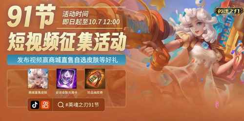 91节短视频征集活动开启 即日起至10月7日12:00,前往抖音、快手投稿短视频,发布时需带上活动话题 #英魂之刃 和 #英魂之刃91节 ,快来分享你在英魂之刃的精彩瞬间或英魂之刃91节活动体验吧,优质作品将有机会获得商城直售自选皮肤、史诗皮肤兑换卡、创作达人勋章(30天)等好礼哦!