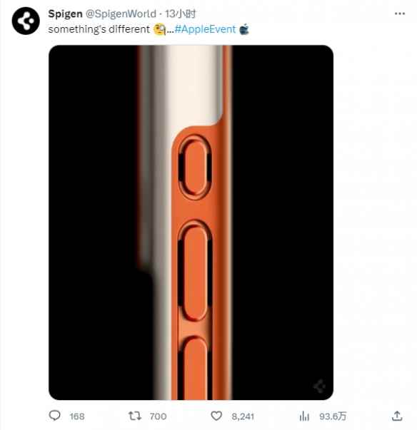 自2007年初代iPhone发布以来,静音拨片一直就是iPhone的标配设计,不过在最新一代iPhone 15的设计中,静音拨片被Action按钮取代。此前的爆料主要来自各种可靠消息源,而现在第三方配件厂商也下场了,确认苹果iPhone 15系列会改用Action按钮。Spigen发布推文,表示“something's different”(有些东西已经发生变化),并附上一张iPhone 15系列的保护套图片。