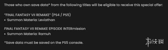 而玩过前作的玩家也并非没有任何奖励,如果玩家的主机上有《最终幻想7:重制版》的存档,玩家将可以获得召唤魔晶石:利维坦。如果有《最终幻想7:重制版》DLC 的存档数据,玩家将可以获得召唤魔晶石:拉姆。