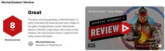 IGN总评: 《真人快打1》是这一传奇系列的又一款优秀作品,但并非没有问题。新的Kameo系统非常出色,对战斗机制进行了巧妙的的改动,解决了《真人快打11》中出现的许多基本问题,精彩的单人故事模式将继续成为该类型游戏的黄金标准。但在线游戏的某些元素让人感觉过时,入侵模式也不够吸引人,需花很长时间才能解锁隐藏在众多宝箱和嘘头十足战斗背后的大多数好东西。尽管如此,《真人快打1》仍然标志着该系列的新开始,是下个时代令人兴奋的起点。