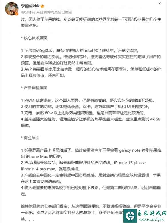 魅族的前高管李楠也是持续发文表示,目前苹果的“黑点”主要在三个层面,分别为核心技术层面、产品体验层面、商业层面。其中,在核心技术层面上,主要问题集中在自研5G基带、软硬件整合能力变弱、AVP目前表现比较失败;在产品体验层面上,主要问题集中在缺少PWM低频调光、缺少便利的本地功能、充电速度较慢、越来越强大的性能,轻薄的追求让手机的热平衡越来越差。