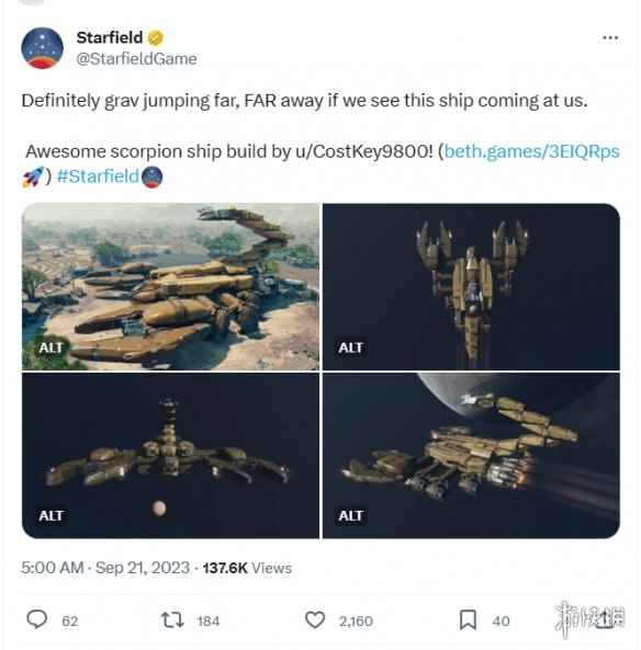 今日,《星空(Starfield)》官方在推特上发文称赞玩家制作的蝎子飞船。